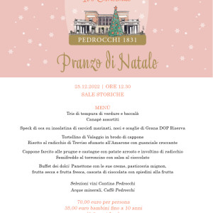 Anche quest'anno, domenica 25 dicembre, ritorna l’imperdibile pranzo di Natale, in una location unica: le Sale Storiche del Caffè Pedrocchi, simbolo indiscusso della città di Padova. Sarà come un viaggio tra i sapori, dove in ogni assaggio troverai il giusto mix di gusti che si fondono assieme e coniugano innovazione e tradizione. Oltre ai prodotti genuini, il pranzo sarà accompagnato da una selezione di vini della Cantina Pedrocchi studiata ad hoc.